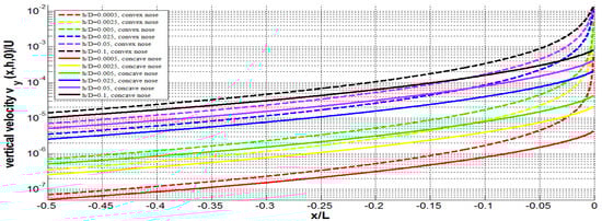 Vertical velocities on the free surface of water upstream to the shapes with concave (solid lines) and convex (dashed lines) noses shown in Figure 3 at different depths.