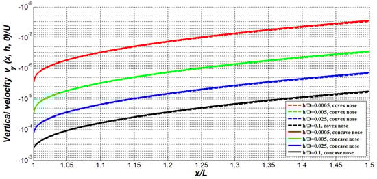 Both shapes shown in Figure 3 have no stagnation points (and high pressures) on the trailing edge (see blue lines at x = 1). Thus, we can expect small magnitudes of the vertical velocities downstream to the trailing edge. Figure 6 illustrates the results of calculations for the body with a concave nose corresponding to the black solid line in Figure 3. The magnitudes of vertical velocities are much lower than the corresponding values upstream to the concave nose shown in Figure 5 (compare solid lines with the same color in Figure 5 and Figure 6). This result can be explained by larger values of the pressure on the body surface near the concave nose in comparison with cp values near the tail (see the solid blue line in Figure 3). The pressure distributions near the tail of both bodies with the concave and convex noses are very close (compare blue lines in Figure 3). This fact yielded very similar values of the vertical velocities on the water surface downstream to the bodies with concave and convex noses at the same depth (compare solid and dashed curves in Figure 6).