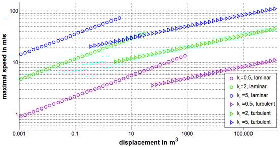 Taking into account Equations (1) and (3), the following estimations for the maximum velocity in the cases of the laminar and turbulent flows can be obtained: