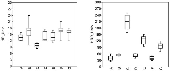 Mean SD and 95% confidence interval for HR and HRR of Unio pictorum. A is Reference site, B is St 1, C is St 2, D is St 6, E is St 9, F is St 10, and G is St 11. Differences in HR were significant (Kruskal–Wallis, H = 29.72, p < 0.0001, n = 8) between following pairs AC (p = 0.019), CD (p = 0.019), CE (p = 0.030), CF (p = 0.019) and CG (p = 0.019), DF (p = 0.041) and EF (p = 0.016). Differences in HRR were significant (Kruskal–Wallis, H = 47.73, p < 0.0001, n = 8) between pairs AB (p = 0.019), AC (p = 0.019), AE (p = 0.019), AG (p = 0.020), BC (p = 0.019), BE (p = 0.018), BG (p = 0.019), CD (p = 0.019), CE (p = 0.019), CF (p = 0.019), CG (p = 0.019), DE (p = 0.018), DG (p = 0.019), EF (p = 0.019), FG (p = 0.020), and CE (p = 0.009) according to Mann–Whitney pairwise comparisons, Bonferroni corrected.