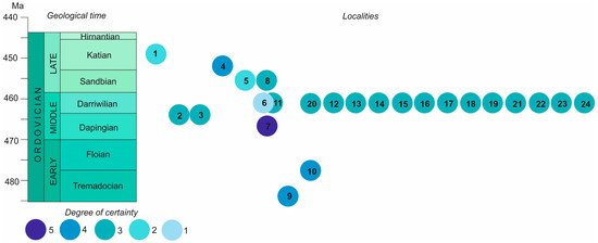 Second, the summarized lines of evidence collected from the existing literature were interpreted. The major palaeotectonic domain (affinity to supercontinents, large continental blocks, and terranes) was established for all localities. For this purpose, the information from the analyzed sources was used together with the consideration of the “fresh” plate tectonic reconstructions [13,14,15]. Indeed, some generalizations and assumptions were unavoidable due to the differences in these reconstructions. The age of the localities was justified against the present version of the international geological time scale of the Ordovician [1,2]. In several cases, the original information did not permit to attribute the localities to the particular stages of this period, and, therefore, the interpreted age was limited to the level of epochs (this should not be too large a generalization taking into account how old are Ordovician deposits). The degree of certainty of the interpretations of tsunamis offered in the original sources was established. The summarized information of the character of evidence allows scoring the localities, where one score signifies the lowest degree of certainty (when the hypothesis is debatable), and five scores signify the highest degree of certainty (when the hypothesis is well-developed and argued extensively). Importantly, the authors of this present work do not express their own opinions on the quality of the previous research and hypotheses and do not evaluate them critically (this task is left for future studies, which will require additional field-based information and methods that are yet to be developed). All these interpretations allow judgments of the spatiotemporal distribution of Ordovician tsunamis and the quality of the related information.