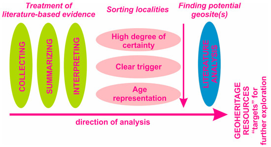 Geoheritage comprises various unique (rare, peculiar) geological features, and its common manifestations are geosites. The latter is not only important to conserve the “fragile” elements of the global geological environment but also useful for scientific developments, educational activities, and tourism. In other words, geoheritage can be described in the words of valuable resources [64,65,66]. To facilitate its effective exploitation in a given area, these resources should be identified properly. Although this can be carried out in the course of territorial geological mapping and specialized research, a more systematic approach can be employed. Tsunami-related geoheritage has already been established [32,33,34,67,68], and it is reasonable to search for geosites representing tsunamis for all periods of the Phanerozoic, including the Ordovician. The bibliographical surveys may provide important lines for evidence for choosing the proper localities.