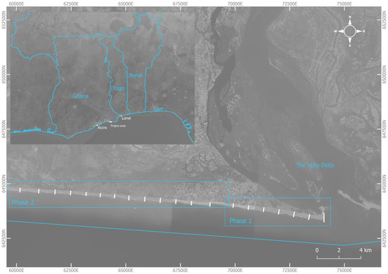 Generally, the Ghanaian coastal areas are low-lying with low beach ridges, having marshes and lagoons behind them. The prevailing direction of the longshore drift current in Ghana is from the west to the east. The Delta of the Volta River protrudes from the general alignment of the coast. According to ref. [21], the continental shelf of Ghana is narrow (widths of 20–80 km between Cape Three Points and the Volta Delta) and the continental slope is steep. Indications of a submarine canyon are reported off the Volta Delta [21]. Features resembling small canyons were observed in the study area from bathymetric surveys. Natural conditions and processes along this coastal stretch cannot be separated from what is happening in other West African coastal countries, as physically, these countries are part of one unique system. The coastal areas of these countries also share the long-term consequences of human intervention on the environment, consequences which cross the borders of each individual country.