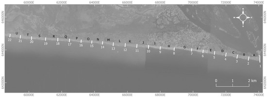 The 15 km long shoreline in study was divided into several cross-sections (or transects). Three transects were defined per beach compartment, one at the mid-point between the two adjacent groyne structures in that compartment and two others at circa 150 m updrift and downdrift of the groynes. Compartments are identified with a letter from A to U, while groyne structures are identified with a number from 1 to 22. The locations of the compartments and groynes considered in this research are shown in Figure 2.