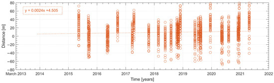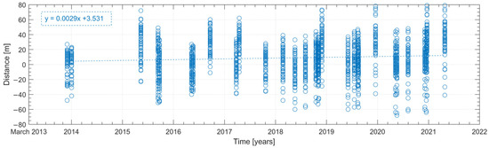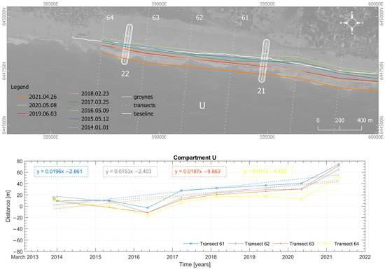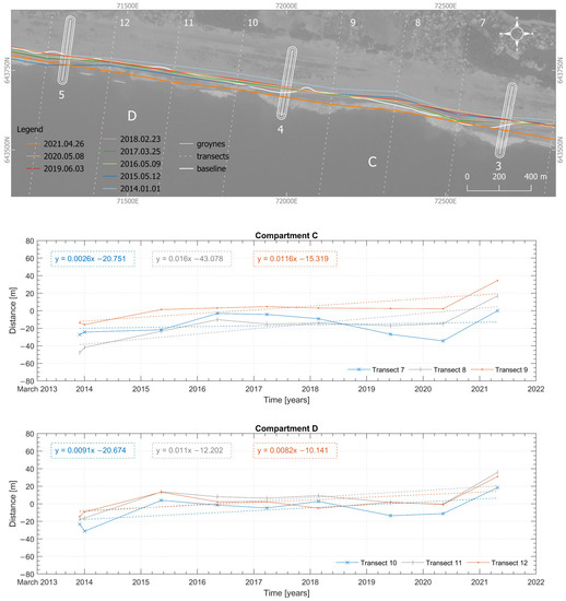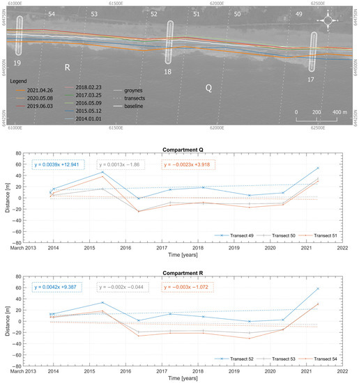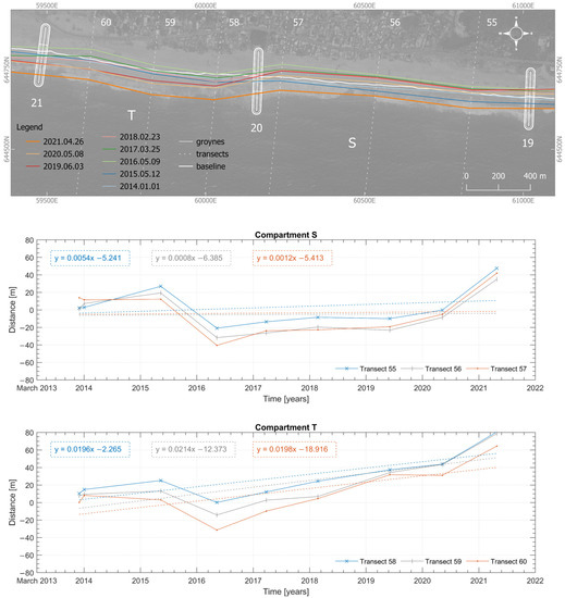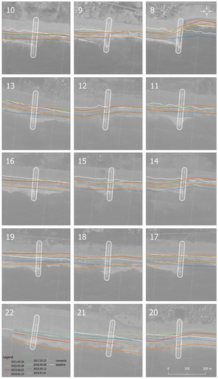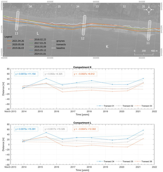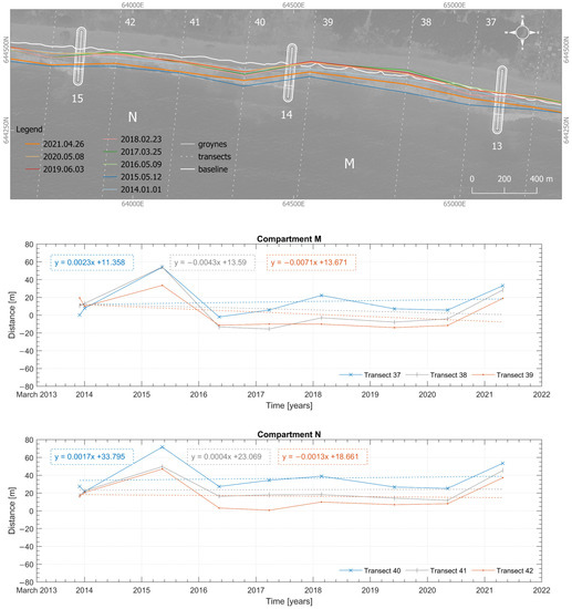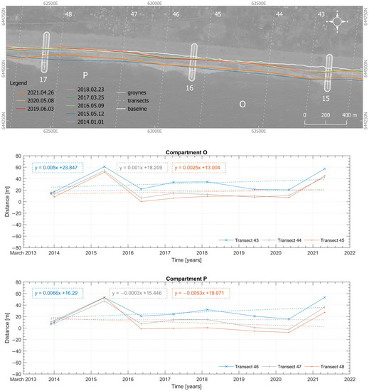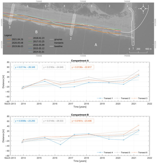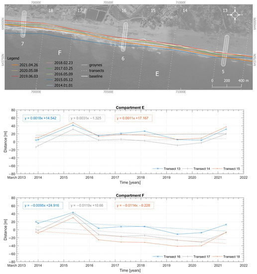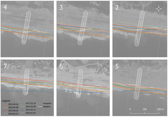 The results for the recent coastline evolution after the implementation of the coastal protection works are presented in Figure 5. It should be noted that the data points in Figure 5 represent the distances of the extracted shoreline to the reference shoreline per image acquisition date in all considered transects.