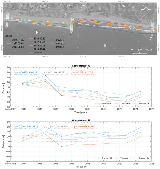 The shoreline evolution within compartment G (Figure 10), the easternmost in Phase 2, is very similar to that observed in compartment F in Phase 1, i.e., a steady shoreline retreat in the period of analysis. With respect to compartment H (Figure 10), no remarkable shoreline changes can be observed within the period of analysis, except those linked to the artificial beach nourishment works that took place here in March–April 2014.