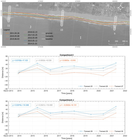 The analysis of the shoreline-extracted positions based on remote sensing observations over the period of analysis is divided into (i) a long-term shoreline evolution before the implementation of the coastal protection works based on a 30-year dataset (Section 4.1) and (ii) a short-term evolution during and after the construction of the coastal protection works (Section 4.2) focusing on the analysis of the shoreline evolution trends after construction per compartment and around groyne structures.