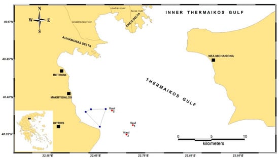 Haul sites (n = 3) for sampling with bottom trawling in the outer Thermaikos Gulf of the Aegean Sea offshore of the coastal zone of Kitros, in the Pieria region of Greece. Field sites were located on edge habitats of a previously constructed artificial reef complex (polygon with blue edges).