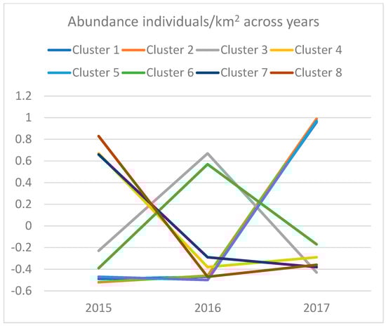 The conclusion that, across the studied years, specimens of the species forming the first two clusters became more numerous but smaller in size is additionally supported by comparing the average lengths of specimens presented in Table 8. These two clusters are the largest, consisting of much larger numbers of marine species than the remaining clusters. Cluster 5 shows a similar but less clear trend. Average abundance factor scores are similar in 2015 and 2016, but visibly higher in 2017. On the other hand, no species from this cluster had the highest biomass in 2017, indicating that marine species from this cluster also became more numerous in 2017, compared to the 2 previous years, but smaller. The survey in 2017 caught larger numbers of smaller specimens of these species. This trend is also visible in Table 8, as the average standardized and normalized lengths of specimens within this cluster increased from 2015 to 2017, and the difference was statistically significant.