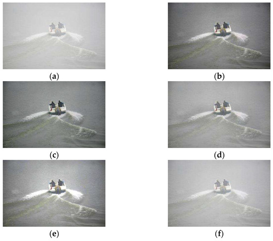 Sea fog is a common meteorological disaster in offshore and coastal areas, often with a large concentration, a low contrast of images containing fog [1,2], and serious loss of details, which hinders the normal operation of maritime target monitoring and visual navigation assisted by unmanned aerial vehicle (UAV) stations [3,4,5]. Therefore, effective sea fog removal methods have important research significance for transportation, fishery, military, and other activities [6,7,8]. The formation of sea fog consists of two steps: condensation of water vapor and low-level accumulation of fog droplets. Analyses of the residue of fog droplets show that the water vapor condensation nucleus is composed of a combustion nucleus, salt particles and soil particles, and the ratio is 5:4:1 [9,10,11,12,13]. Among them, the radius of the combustion core is approximately 1 μm, and the surface is covered with a film with strong moisture absorption and condensation. As a result, the concentration of hygroscopic particles in the sea surface air is higher, resulting in more fog at the sea than inland. After the accumulation of fog droplets at low altitude, the diameter is generally approximately 10 μm, which size is small and the droplets suspend in the offshore air, resulting in low atmospheric visibility. Due to the influence of day and night temperature changes, offshore and coastal areas have the characteristics of high air humidity, rapid formation of sea fog, long duration, and large concentration. At the same time, the presence of reflective water surface and spray will also lead to overexposure of the image, and various factors have increased the difficulty of sea fog removal.