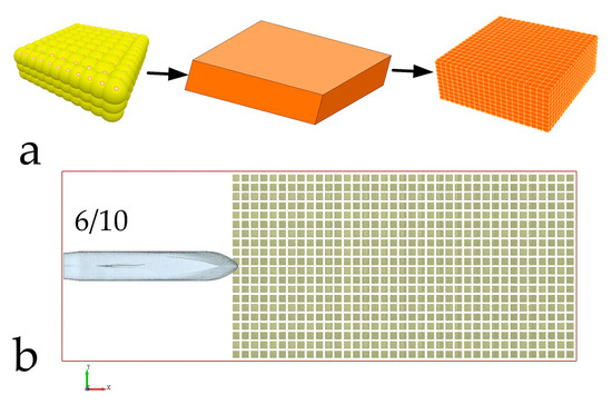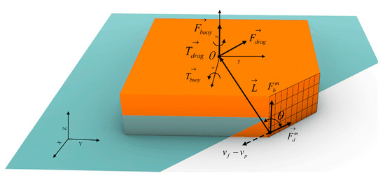 The interaction of water with ice floes mainly includes the buoyancy force and drag force, which are shown in Figure 2. The infinitesimal element method (IEM) was used to calculate these forces. The IEM is used to treat the ice floe, which is composed of clusters of particles, as a regular cuboid, and then the cuboid is uniformly discretized into several infinitesimal elements, as shown in Figure 3a. Next, the forces of each element are calculated by fixing the water level, using the Archimedes’s and drag formula. The forces of the elements are finally converted to the center of the mass of the ice floe, and then the buoyancy and drag force of the entire ice floe are calculated. Part a in Figure 3 details a schematic diagram of the discretization process.
