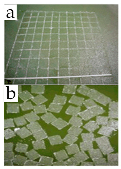 Direct towing tests of the Araon were carried out at the KIOST’s ice tank. The towing speeds were 0.238, 0.357, and 0.476 m/s; the sizes of the ice floe were 0.25 × 0.25 × 0.04 m and 0.12 × 0.12 × 0.04 m; and the concentration was 6/10. The cutting of the parental ice sheet and the resulting ice floe field for the tests are shown in Figure 4. The lines of the Araon are outlined in Figure 5 [4,43]. The main parameters of the Araon are detailed in Table 1. To avoid the influence of floe distribution on the numerical simulation results, ice floes in all simulations are uniformly distributed, as shown in Figure 3b.