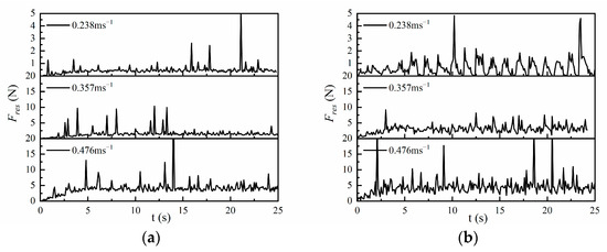 Time history of ice resistance of the Araon at different speeds: (a) 0.12 × 0.12 m and (b) 0.25 × 0.25 m.