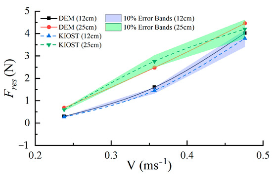 Figure 6 shows the ice resistance curves of the Araon. Figure 7 shows a comparison between DEM simulation values and KIOST test values, which are in good agreement. The general trend of the ice resistance value is consistent with the increase in ship speed, and more violent collisions of ship–ice are one of the reasons for the increase in the ice resistance value. The main cause of the ice load acting on the ship is the process of the hull displacing the ice floes and forming the channel. An increase in speed causes the hull to travel more distance in the same amount of time, which, in turn, displaces more ice floes, which intensifies the collision between the hull and the ice floes and consumes more energy, resulting in an increase in resistance. The simulation values are within 15% error bands, of which the maximum error is 13.33% and the average absolute error is 9.45%. The errors may be due to the distribution of ice floe and the secondary breaking of ice floe during the tests.