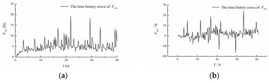 From Figure 24a,c,e, we can see that the average extreme values of ice resistance, , in different periods are 14.3 N, 11.2 N, and 8.68 N, respectively. The of T = 8 s is 1.28 times that of T = 12 s and 1.64 times that of T = 16 s in the sway motion. From Figure 24b,d,f, it can be seen that the average absolute values of the extreme values of transverse force, , under different periods are 35.7 N, 27.4 N, and 17.6 N. The of T = 8 s is 1.31 times that of T = 12 s and 2.03 times that of T = 16 s in the sway motion. In addition, Figure 26 compares the and of yawing and swaying in each period, and it can be found that the extreme load of yawing is about 51~71% higher than that of swaying in the same period.