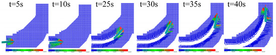 Figure 10 and Figure 11 detail the time history curves of ice resistance and transverse force and the changes in total energy between ice floe and ship at 5 s, 10 s, 25 s, 30 s, 35 s, and 40 s, respectively. It can be seen from Figure 10 and Figure 11 that ice resistance increases from 0 s to 5 s and no longer increases with time when most of the hull enters the ice floe field. After t = 10 s, the hull begins to carry out a constant radius motion; at this stage, the ice resistance increased slightly, but after about t = 20 s, the ice resistance no longer increased with time and fluctuated within a range. In the Y direction of the hull, the t = 0~10 s hull is in the transitory stage, and the transverse force fluctuates greatly. After t = 10 s, there were many ship–ice interactions on both sides of the hull. It can be seen in Figure 11 that the influence area of the port side on the ice floe field is significantly greater than that of the starboard side, so the transverse force points toward the starboard side. After t = 20 s, the transverse force no longer increases with time and fluctuates roughly in a range.