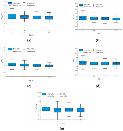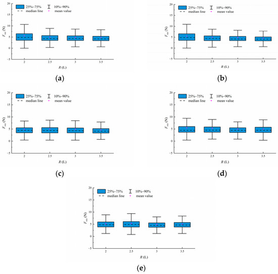 Box-plot diagram of ice resistance changing with turning radius at different drift angles: (a) , (b) , (c) , (d) , and (e) .