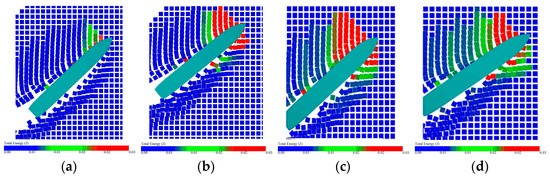 The change in ice total energy under different turning radii in : (a) R = 2 L, (b) R = 2.5 L, (c) R = 3 L, and (d) R = 3.5 L.