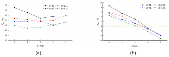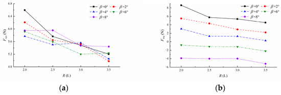 The variation in average ice loads under different turning radii: (a) the variation curve of and (b) the variation curve of .