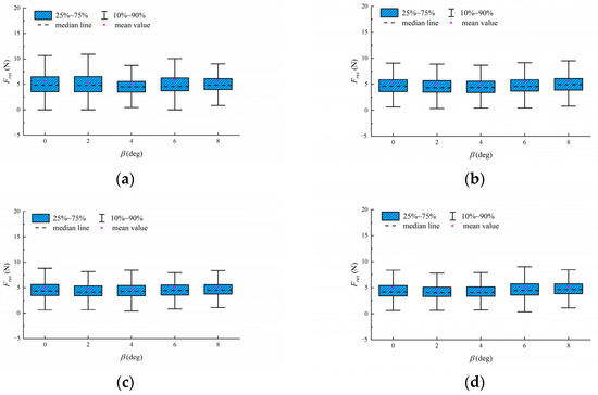 Box-plot diagram of ice resistance changing with drift angles at different turning radii: (a) R = 2 L, (b) R = 2.5 L, (c) R = 3 L, and (d) R = 3.5 L.