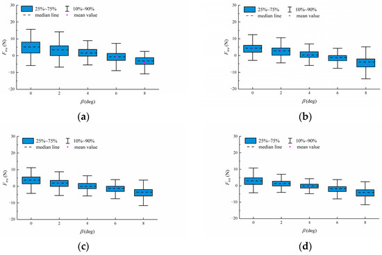 Box-plot diagram of transverse force changing with drift angles at different turning radii: (a) R = 2 L, (b) R = 2.5 L, (c) R = 3 L, and (d) R = 3.5 L.