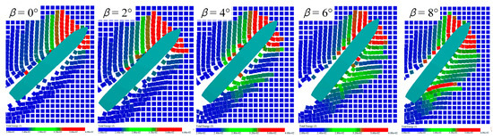 With the increase in the drift angle, the interaction between the two sides of the mid-ship and the ice floe changes greatly. Figure 19 shows the change in the total energy at different drift angles at R = 2 L. The collision between the ship and the ice floe mainly concentrates on the port side and the bow, and there was almost no contact collision with ice floe on the mid-ship starboard side in . With the increase in the drift angle, form Figure 19, a reasonable speculation can be made that the contact surface between the ice floe and mid-ship starboard side gradually increases, and it is expected that the influence range on the starboard side increases, while the influence range of the port side significantly decreases. When the drift angle increases to 6~8 deg, the port side of the mid-ship only collides with a small amount of ice floe, and a small open area is formed from the mid-ship port side to the stern. In other words, the interaction between the ice floe and the mid-ship starboard intensifies, while the mid-ship port weakens. Within this ebb and flow, the transverse force changes from pointing to starboard to pointing to port.