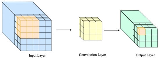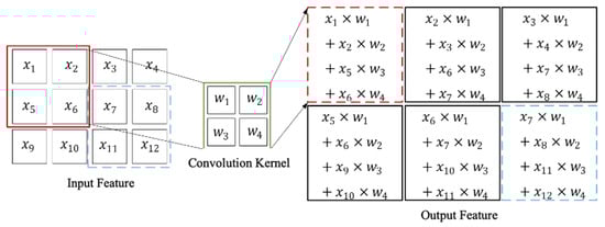 In neural networks, neurons are organized into layers, where each neuron receives input from neurons in the previous layer and provides output to neurons in the next layer. represents the value of the jth neuron in layer l + 1, and represents the value of the ith neuron in layer l. The connection between the ith and jth neurons is represented by the weight , and the output is influenced by the bias . An activation function is applied to the weighted sum of inputs. Figure 1 illustrates the main steps of the convolutional operation. After obtaining the features through convolution, pooling operation aggregates local features in the image through statistical operations, further extracting features and improving the network’s computational efficiency.