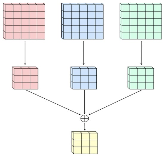 In Figure 3, sliding is performed at three positions horizontally and three positions vertically (3 = 5 − 3 + 1). After element-wise addition in the depth direction, one output channel is obtained.