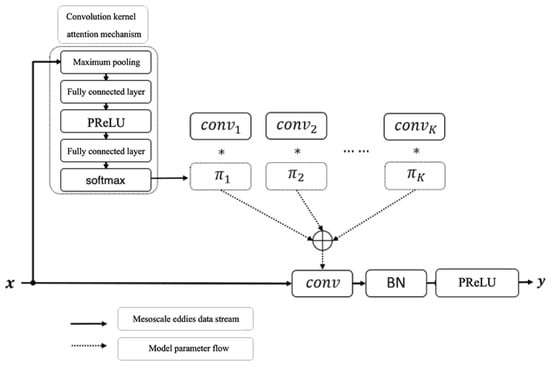 Traditional convolutional layer designs usually employ static convolutional kernels. To enhance performance, model depth or width can be increased. Model depth can be increased by adding convolutional layers, fully connected layers, and activation function layers, while model width can be increased by enlarging the convolutional kernel size or input–output channel numbers. Although both methods can enhance model complexity and performance, they also consume more space and computational resources. Compared to traditional convolutional layers, dynamic convolution can adaptively generate convolutional kernel parameters, avoiding the limitation of fixed convolutional kernels, and better exploring features related to temperature, salinity, and other parameters in mesoscale eddy data. Additionally, dynamic convolution considers computational costs and spatial capacity during design. As a result, dynamic convolution not only improves model performance but also flexibly adapts to different task requirements while maintaining computational efficiency and space utilization.