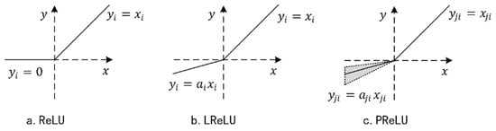To alleviate this ReLU limitation, Maas et al. [] introduced the Leaky Rectified Linear Unit (LReLU) as an alternative solution. However, LReLU’s performance strongly depended on the set slope parameter , making it challenging for practical applications. To address the issue of setting , He et al. [] proposed the Parametric Rectified Linear Unit (PReLU) method. PReLU generated the hyperparameter using a Gaussian distribution and automatically adjusted it during testing. The various activation functions are shown in Figure 7, demonstrating that PReLU significantly enhanced the training efficiency and accuracy of CNN.