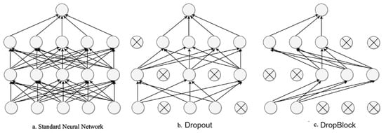 DropBlock is an extension of Dropout to the convolutional layer. Its principle is simple, but it differs significantly from Dropout in that it masks a continuous block region, as shown in Figure 9.