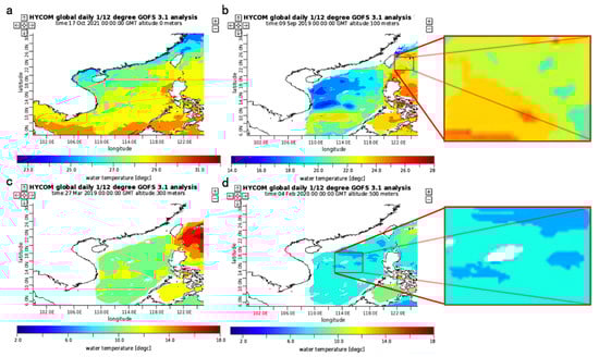 Schematic diagram of HYCOM temperature data at different periods in the South China Sea, with depths of 0 m, 100 m, 300 m, and 500 m for (a–d). Clear temperature anomalies can be observed in the red box.