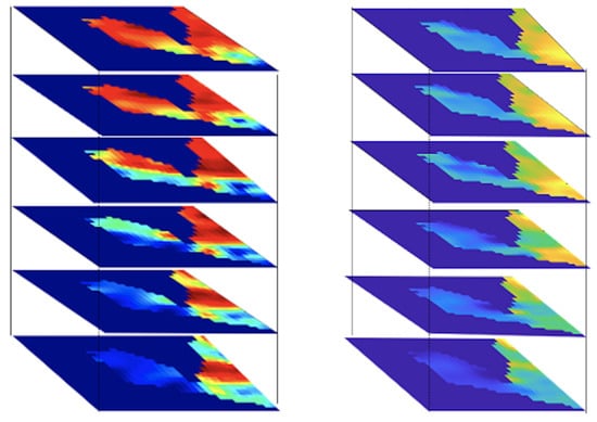 The South China Sea is one of the largest semi-enclosed marginal seas in the western Pacific, with a complex ocean current system, and it exhibits a wealth of mesoscale eddy phenomena []. Figure 10, respectively, illustrates the sea surface temperature of HYCOM data at different times and depths.