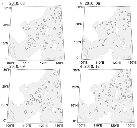 Mesoscale eddy labels in the South China Sea for different time periods.