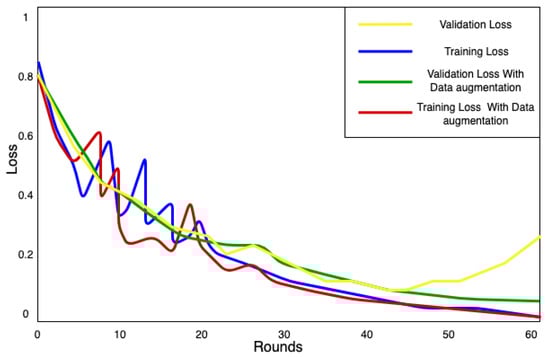 During the neural network model training, data augmentation techniques are used to improve the feature extraction capability of the 3D-EddyNet. Data augmentation, originally proposed by Dempster et al. [], is a data expansion technique that aims to create as many useful data as possible from a limited set of mesoscale eddy data. Given the nature of neural network learning, it is crucial to maximize the volume of relevant data in the augmented dataset by leveraging the existing data. Supervised classification data augmentation involves applying predefined data transformation rules to augment existing data. This includes both single-sample data augmentation and multi-sample data augmentation. Due to the specific characteristics of HYCOM data, multi-sample data augmentation or color transformations are not suitable for this dataset; geometric transformations like mirroring and rotation are simple yet effective techniques within the single-sample data augmentation category. This enhances the quality of features extracted and avoids overfitting during the 3D-EddyNet training process, as shown in Figure 14; the validation set without data augmentation showed significant overfitting after 40 rounds.