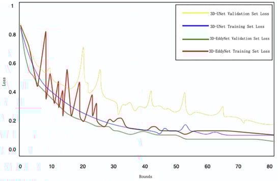 Furthermore, the loss accuracy curves of the two models are analyzed. When using the 3D-UNet network for comparison training, the training loss gradually decreases, and the learning rate also decreases continuously. The final loss values converge to around 0.2. The training set generally stabilizes around 60 epochs out of 80, while the validation set’s loss continues to decrease, but with some oscillations.