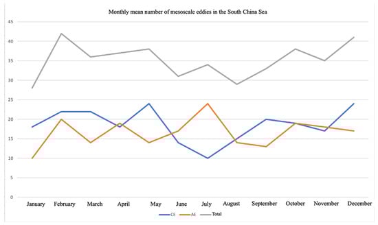 In 2012, the average number of mesoscale eddies detected per month was analyzed and presented in Figure 16, showing the monthly variations.