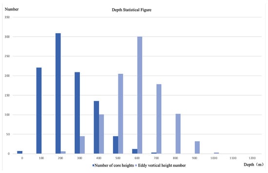 Regarding the eddy radii statistics, to eliminate seasonal effects, weekly images from 2012 were taken, and statistical analyses of the eddy radii and vertical depths were performed. The relationship between the core position and the number of eddies with depth is shown in Figure 17. The results demonstrated that eddy cores were mainly located at depths between 100 and 300 m, while eddies were generally observed at depths exceeding 1000 m. The eddy radii gradually decreased with depth, with AE exhibiting higher numbers and larger average radii than CE above 200 m, while below 200 m, CE had more significant numbers and larger average radii than AE, consistent with the previously described patterns. This aligns with the findings of Lin [] in their statistical analysis of mesoscale eddy data in the South China Sea. The number of CE and AE in different depth ranges showed a particular trend: CE dominated above 350 m, while below 350 m, AE became more prevalent.