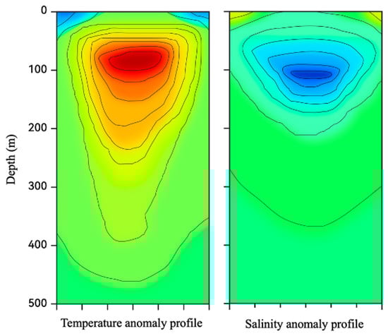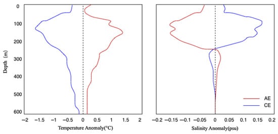 Regarding the three-dimensional morphology analysis, the temperature and salinity anomalies in the dataset were combined and processed to obtain the composite average temperature and salinity anomalies of eddies with depth. The results showed that the temperature anomaly peaked at 110 m in the center of the composite CE and at 100 m in the center of the composite AE. The temperature anomalies for CE and AE were approximately −1.6 °C and 1.5 °C, respectively, while the salinity anomalies were approximately 0.15 psu and −0.17 psu. The structures of temperature and salinity anomalies exhibited differences, with temperature anomalies often vertically extending between 300 and 500 m, while salinity anomalies were primarily confined to the upper 200 m, with a counter-directional movement near 300 m.
