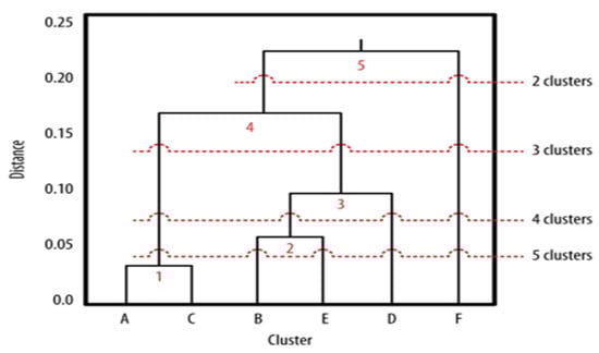 Hierarchical clustering is often represented visually using a dendrogram, similar to the illustration shown in Figure 4. The positioning of a threshold holds significant importance, as it determines whether data points are organized into a larger or smaller number of clusters. Raising the threshold on the dendrogram results in fewer clusters while lowering it leads to a greater number of clusters being formed.