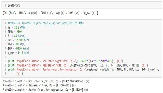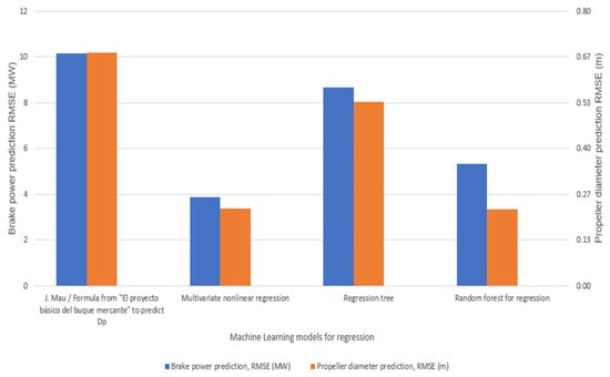 The investigation yielded noteworthy findings regarding the performance of each machine-learning algorithm in predicting braking power and propeller diameter. The root mean square error (RMSE) values for these predictions were consistently lower than those derived from J. Mau’s braking power calculation formula and the propeller diameter formula [19], p. 602. These improved predictions effectively address the initial query about the quality of the machine learning predictions posed at the study’s outset.