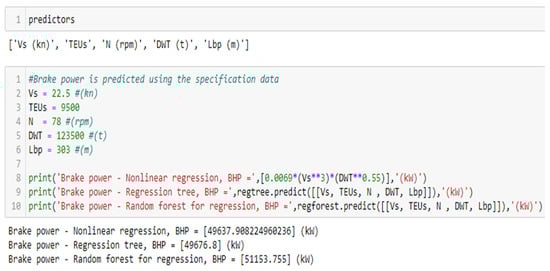 The maritime industry is displaying notable interest in the adoption of cutting-edge technologies within the scope of Industry 4.0, aiming to digitalize both companies and processes. At the core of data science lies machine learning, which serves as the focal point of this article. This study seeks to accomplish two main objectives: firstly, an exploration of various machine learning algorithms, and subsequently, the application of these techniques to analyze predictions within the propulsion system of a 9500 TEU container ship. The outcomes of the study reveal that utilizing distinct machine learning algorithms for predicting braking performance yields a lower mean square error (MSE) when compared to the discrepancy introduced by the J. Mau formula, as evident in the container ship database. The selection of propulsion engines was based on predictions for a 9500 TEU container ship. Similarly, promising outcomes were achieved in predicting propeller diameter in comparison to conventional methods. Thus, these predictions can also effectively guide the appropriate choice of propeller diameter.