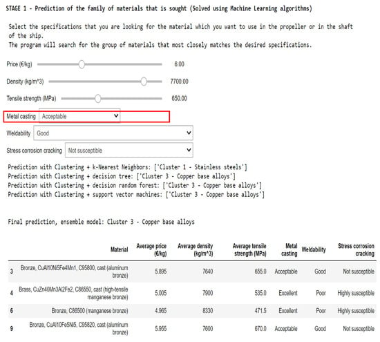 During the initial stage, the desired specifications are designated by manipulating the control bars and selecting options from choice boxes. Following this, the first stage yields a cluster prediction along with a corresponding table listing the materials affiliated with that cluster. Once the initial stage concludes, the program advances to the second stage.