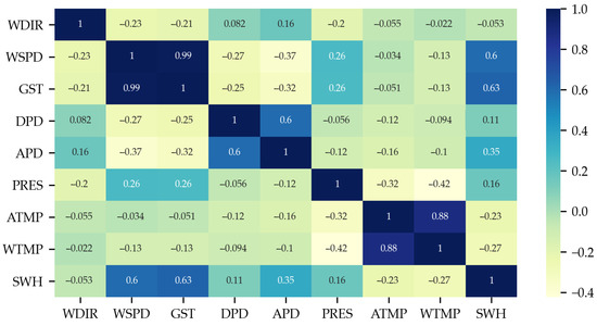 Feature selection is a key step in time series forecasting. The buoy data collected by the NDBC included wave information, wind field information, and other environmental features. Wave information consisted of SWH, dominant wave period (DPD), and average wave period (APD); wind field information included wind speed (WSPD), wind direction (WDIR), and peak 5 or 8 s gust speed (GST); and environmental information was composed of air temperature (ATMP), sea surface temperature (WTMP), and sea level pressure (PRES). After data cleaning, a correlation analysis was performed on all buoy feature data by calculating the Pearson correlation coefficients between the features. The results are shown in Figure 3.