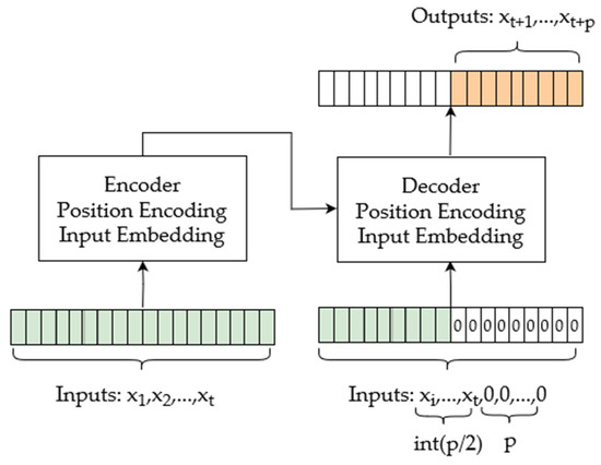 The input of a traditional transformer model [27] is historical features, and various feature results for the next time step are output. To achieve continuous SWH forecasting, an iterative approach is required, which is inefficient and time-consuming. Therefore, we referred to the generative inference in the literature [30], which generates all the results for the forecasted time steps in one forward step. The specific input and output formats are shown in Figure 5.