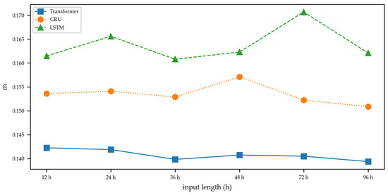 To explore the influence of different input sequence lengths on the forecasting results of sequences of the same length, Figure 6 shows the MAE results for the three machine-learning models, each using historical features from the previous 12 h, 24 h, 36 h, 48 h, 72 h, and 96 h as inputs, respectively, to forecast the SWHs of the next continuous 12 h. It can be seen that the transformer model results were less affected by different input sequence lengths, the error curve changed relatively smoothly, and the error results for different inputs were similar. However, the GRU and LSTM models showed variations in the forecasting performance under different input lengths. Our transformer model learned the dependencies between different positions in the input sequence through its attention mechanism. Thus, it was less affected by the length of the input sequence.