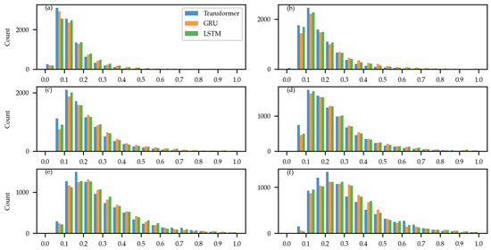 Figure 7a–f present the frequency histograms of the average MAEs for continuous 12 h, 24 h, 36 h, 48 h, 72 h, and 96 h sequence forecasting. The transformer model exhibited a high frequency of small errors and a low frequency of large errors in terms of the MAEs compared to those of GRU and LSTM in the forecasting of different sequences, especially long sequences, as shown in Figure 7e,f.