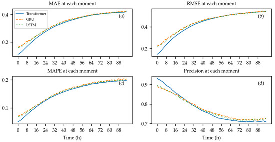 Comparison of (a) MAE; (b) RMSE; (c) MAPE; (d) Precision at different time steps of continuous 96 h forecasting results from transformer (blue), GRU (orange), and LSTM (green).