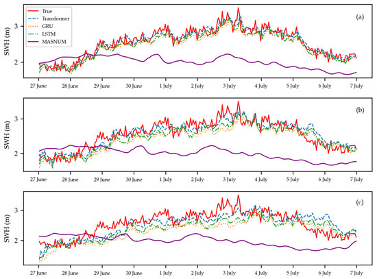 Typhoon Aere originated from a tropical disturbance in the east–southeast of Palau on 27 June 2022. It traveled northward, crossing the East China Sea, and made landfall on the northern island of Hokkaido, Japan, gradually dissipating thereafter. Figure 9 shows the three machine-learning models and MASNUM numerical model fitting results of wave height changes near the Hawaiian Islands within ten days of 27 June 2022. Figure 9a–c represent the forecasting results made 1 h, 12 h, and 24 h in advance, respectively. During this time period, there were large waves due to the influence of cyclones in the northwest Pacific, and the central Pacific waves responded to the strong atmospheric disturbances, leading to an increasing trend in SWH. All three machine-learning models accurately fit the SWH envolution within the 1 h forecast horizon, but underestimation was observed at the peak values, and overestimation was noted at the troughs. As the forecast horizon extended to 24 h, the accuracy of all three machine-learning models declined, but they still outperformed the MASNUM numerical models. The three machine-learning models consistently underestimated the SWH during the rising phase and overestimated them during the falling phase. The forecasting results of the transformer model were closer to the true values than those of GRU and LSTM. It is noteworthy that the three machine-learning models underestimated the prediction of SWH. This discrepancy can be attributed to the machine-learning models being trained on data primarily from normal conditions, with limited inclusion of typhoon-induced wave data. Consequently, the models may fail to accurately capture all the characteristics of wave envolution in the central and eastern Pacific Ocean during typhoons in the western Pacific. As a result, the forecast of SWH specifically related to typhoon-induced conditions may be flawed. To improve the prediction accuracy under extreme conditions, it is advisable to incorporate targeted training using typhoon-induced wave data, which may yield better outcomes [9].
