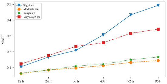 Figure 10 shows the MAPE results for different wave scale levels. The MAPE for each wave scale level increased with the forecasting time, exhibiting an upward trend and depending on the data volume. The MAPE growth rate was slow for moderate sea and rough sea and the fastest for slight sea. Considering the accidental errors caused by the uneven sample distribution, the reliability of the transformer model in forecasting SWH for different wave scale levels was affected to some extent.